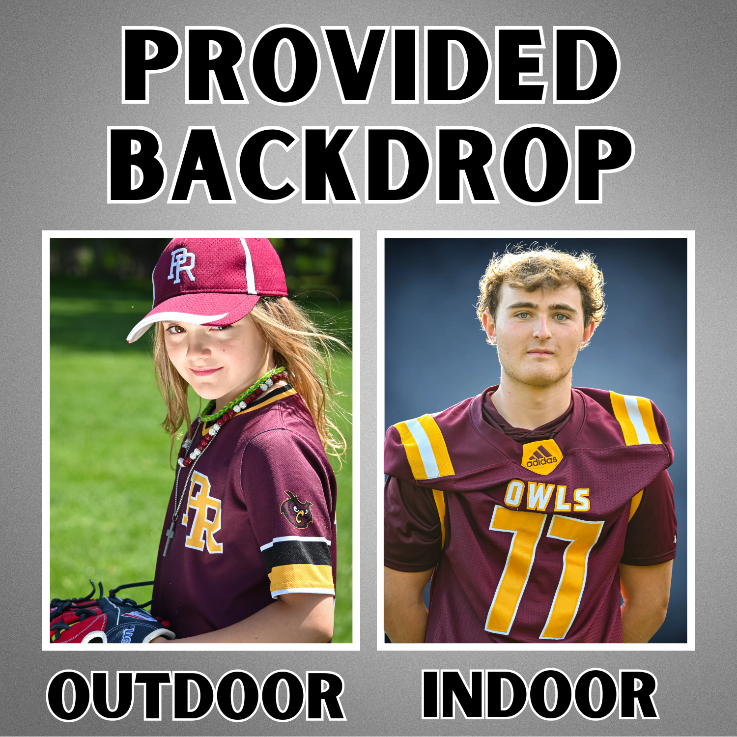 PROVIDED BACKDROP: The backdrop that is provided on the day of the athletes photos will be the backdrop used. For example, if the photos are indoors with a white backdrop, that is how they will be received.