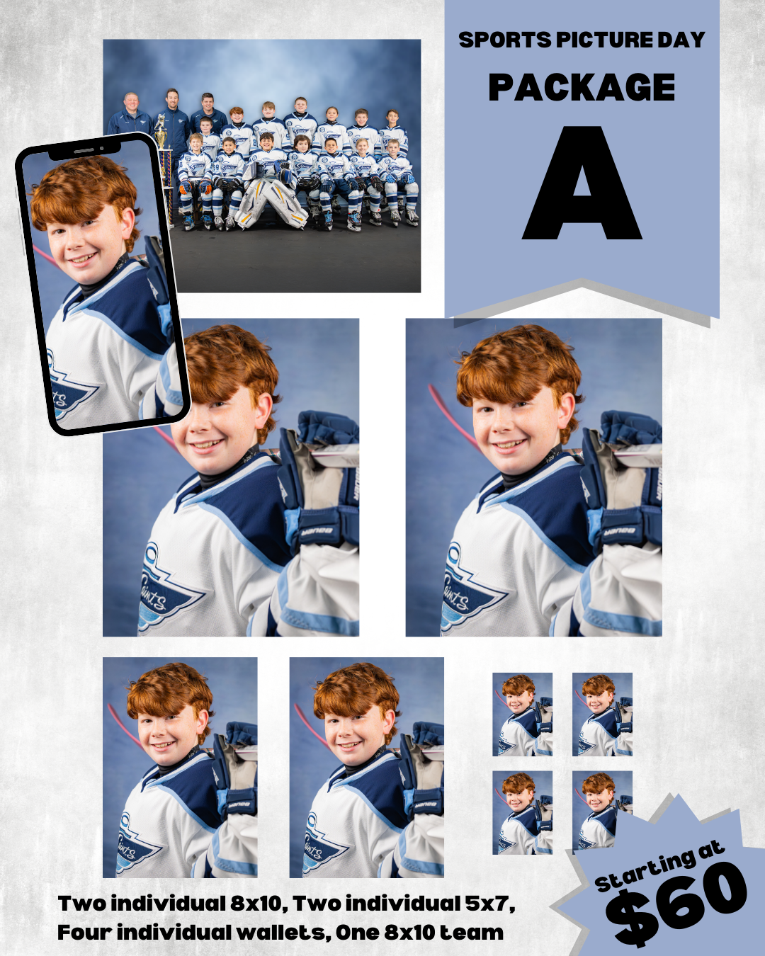 Starting at $60, Package A includes two individual 8x10s, two individual 5x7s, four individual wallets, and one 8x10 team photo.